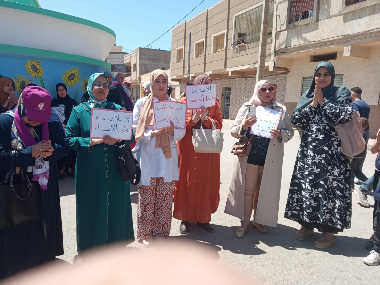 وجاء تنظيم هذه الوقفة التضامنية، بدعوة من النقابة الوطنية للتعليم، تعبيراً عن دعمهم للأستاذ مصطفى ل. والأطر العاملة بالمؤسسة، بعد تعرض الأستاذ لاعتداء لفظي داخل حرم المدرسة من طرف أم أحد التلاميذ.وعرفت الوقفة حضوراً لافتاً، حيث شارك فيها العشرات من أمهات وآباء التلاميذ، إلى جانب عدد من الأساتذة المنضوين تحت لواء النقابة الوطنية للتعليم، الذين رفعوا شعارات تندد بكل أشكال العنف الموجهة للأسرة التعليمية، مطالبين بحماية نساء ورجال التعليم وفرض هيبة المؤسسات التربوية.
