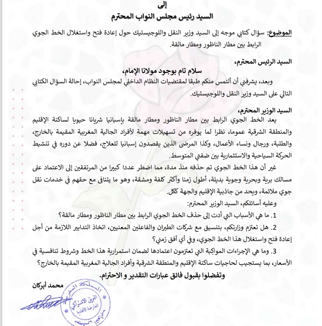 وجّه البرلماني محمد ابرشان عن الاتحاد الاشتراكي سؤالين كتابيين إلى وزير النقل واللوجستيك، بخصوص الوضعية الصعبة التي يعيشها إقليم الناظور على مستوى النقل الجوي، سواء داخلياً أو في ارتباطه الخارجي عبر الخط الذي كان يربط مطار الناظور بمدينة مالقة الإسبانية قبل حذفه بشكل مفاجئ.وقد ركّز السؤال الأول على مطلب إعادة فتح خط الناظور – مالقة، الذي شكّل لسنوات شرياناً مهماً لساكنة الإقليم والمنطقة الشرقية عموماً، لما يوفره من تسهيلات لعدد كبير من أفراد الجالية المغربية المقيمة بالخارج، والطلبة، ورجال الأعمال، والمرضى الذين يقصدون إسبانيا للعلاج.
