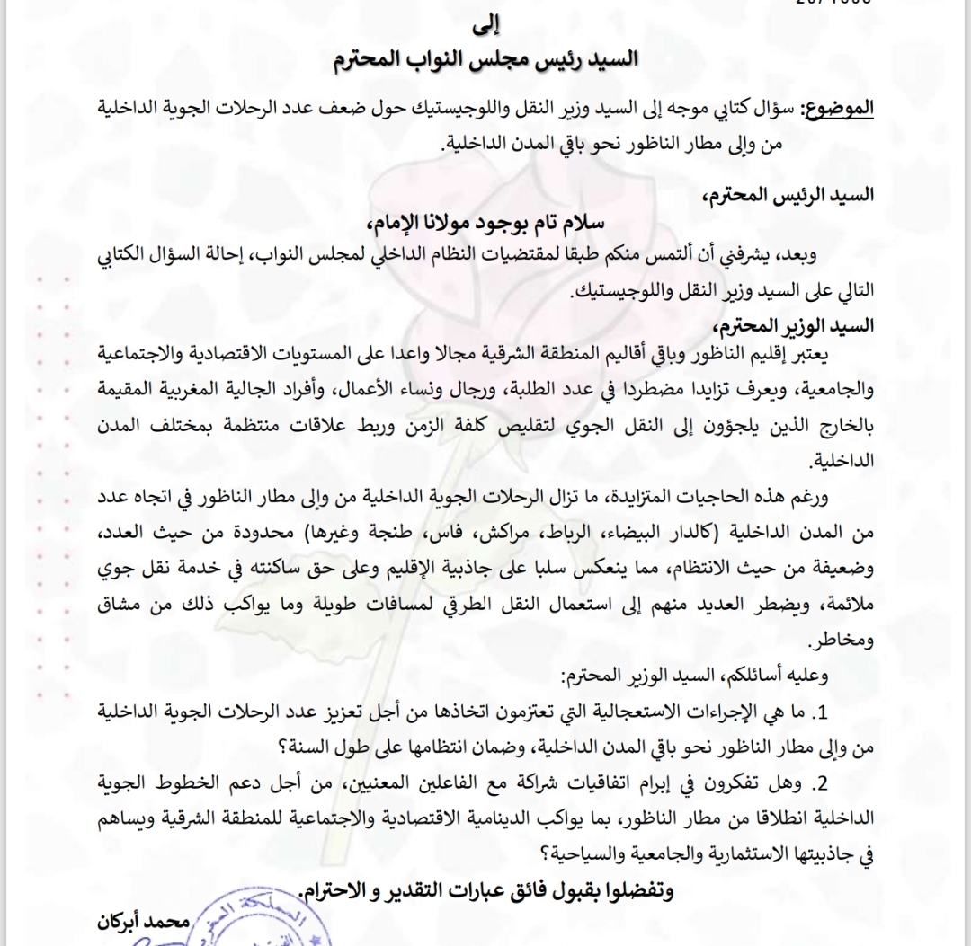 وأشار البرلماني إلى أن حذف هذا الخط أجبر المسافرين على اللجوء إلى مسافات أطول ومسارات أكثر كلفة ومشقة، وهو ما أثر بشكل واضح على الحركة السياحية والاستثمارية بين ضفتي المتوسط. وطالبوا الوزير بالكشف عن الأسباب الحقيقية التي أدت إلى إلغائه، وباتخاذ التدابير اللازمة لإعادة تشغيله وفق شروط تضمن استمراريته وتجاوبه مع حاجيات الساكنة.أما السؤال الثاني، فقد أثار استمرار محدودية الرحلات الجوية الداخلية من وإلى مطار الناظور، رغم تزايد الطلب من طرف الطلبة ورجال ونساء الأعمال وأفراد الجالية المغربية.