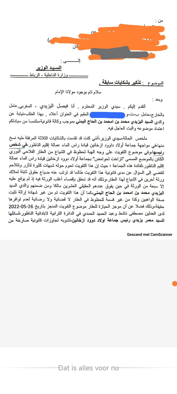 وفي سياق متصل، رفعت شكاية أخرى إلى وزير الداخلية تحمل طابع “تذكير بشكايات سابقة”، تتعلق هذه المرة بملف تفويت عقار فلاحي بدوار أولاد داود الزخانين، في ظروف وصفت بـ”الملتبسة”. الشكاية تشير إلى أن عملية التفويت تمت لفائدة أحد أقارب رئيس الجماعة، رغم وجود ورثة آخرين، ودون استكمال المساطر القانونية المرتبطة بقسمة الملك أو الإدلاء بما يثبت الصفة القانونية الكاملة للمستفيد.وتذهب المعطيات الواردة في الشكاية إلى حد الحديث عن “تواطؤ إداري” وتجاوزات مسطرية، من بينها إنجاز وثائق دون سند قانوني واضح، مما يفتح الباب أمام فرضية استغلال النفوذ والتدخل في مساطر إدارية ذات طابع عقاري حساس.أمام خطورة هذه الاتهامات، يطالب فاعلون محليون بضرورة إيفاد لجنة تفتيش مركزية من وزارة الداخلية والمجلس الأعلى للحسابات للوقوف على حقيقة ما يجري داخل الجماعة، وترتيب المسؤوليات وفق ما ينص عليه القانون، خاصة وأن الأمر يتعلق بتدبير المال العام وحقوق مواطنين.