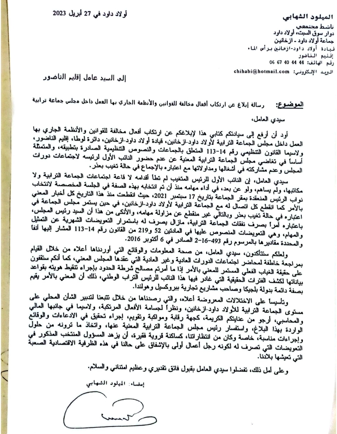 ففي مراسلة موجهة إلى عامل إقليم الناظور بتاريخ 27 أبريل 2023، تم التبليغ عن ما وُصف بـ”أفعال مخالفة للقوانين والأنظمة الجاري بها العمل” داخل مجلس الجماعة، مع الإشارة إلى خرق مقتضيات القانون التنظيمي 113.14 المتعلق بالجماعات.