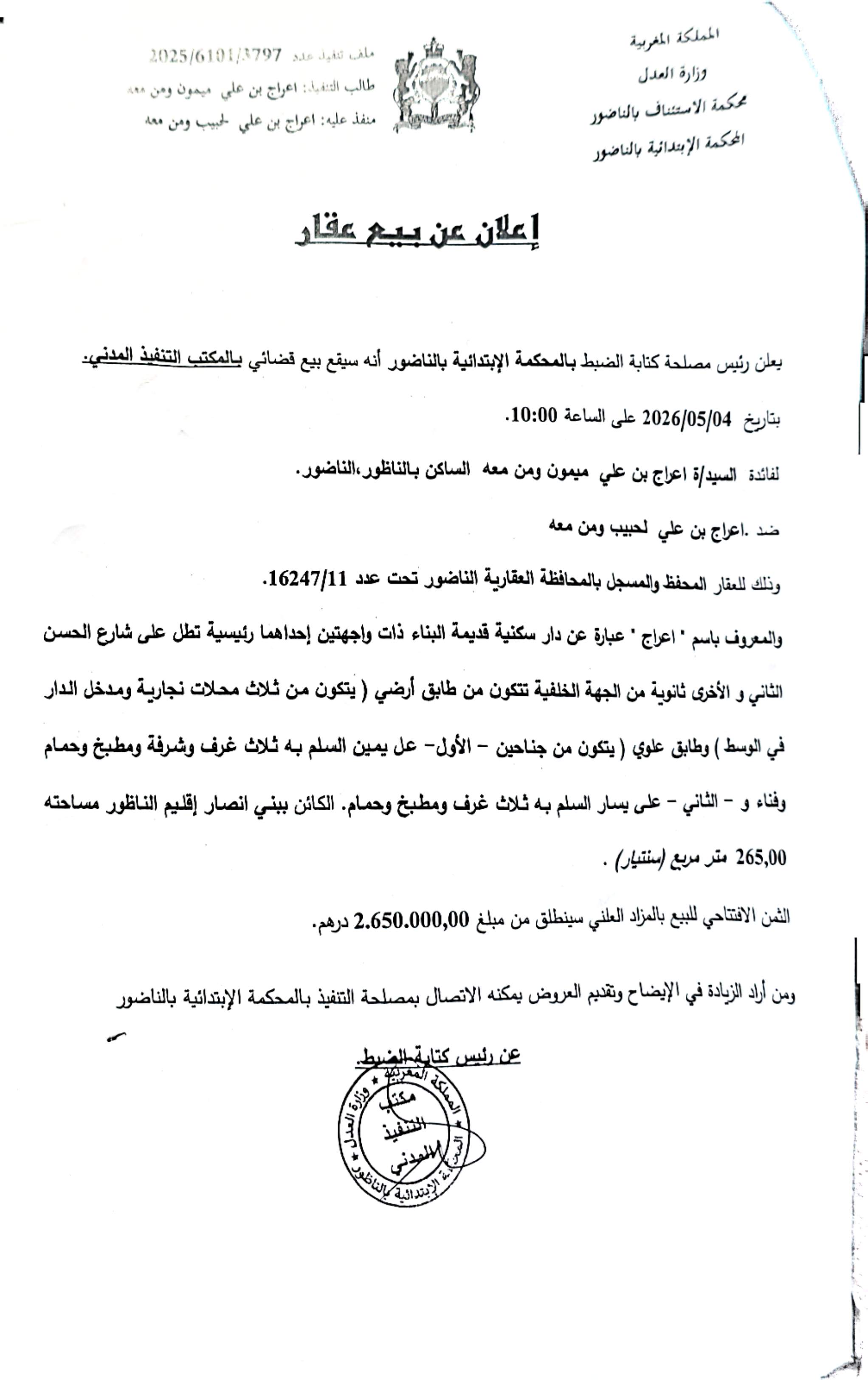 أعلنت مصلحة كتابة الضبط بالمحكمة الابتدائية بالناظور عن تنظيم بيع قضائي لعقار بالمزاد العلني، وذلك في إطار مسطرة التنفيذ لفائدة السيدة إعراج بنت علي ميمون ومن معها، ضد إعراج بن علي لحبيب ومن معه.وحسب مضمون الإعلان، فإن عملية البيع ستجرى يوم 4 ماي 2026 على الساعة العاشرة صباحاً بمقر المحكمة، وتشمل عقاراً محفظاً تحت عدد 11/16247 بالمحافظة العقارية بالناظور، عبارة عن دار سكنية قديمة ذات واجهتين، تقع بموقع استراتيجي مطل على شارع الحسن الثاني.